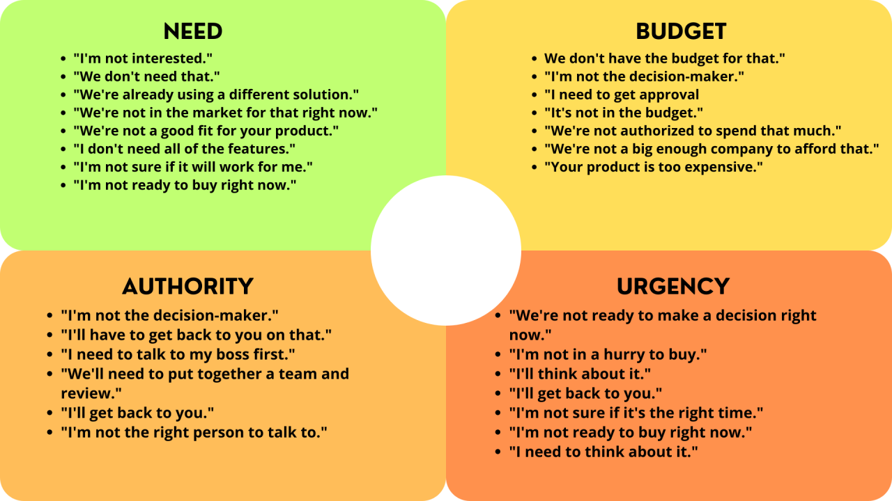 Q: What are the four main categories of sales objections? A: The four main categories of sales objections are Need, Budget, Authority, and Urgency.